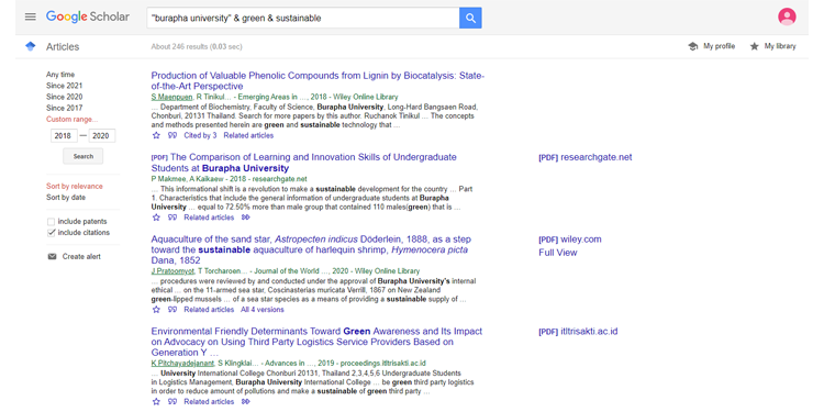 The scholarly publications on sustainability of Burapha university in the academic year 2018-2020. A total publication over the last 3 years is 246, therefore average per annum of 82 publications